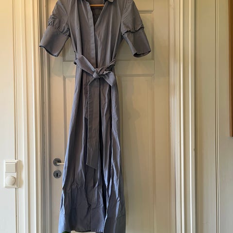 Gina Tricot hverdagskjole i størrelse XS. Kjolen er i blå viskose og har krage, korte ermer og knepping foran. Lengden går omtrent til leggen, og passformen er innsvinget i midjen. Egnet som hverdagskjole.