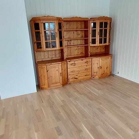 Skjenken og vitrineskapet følger en robust eikeserie fra Rodeo. Møblene er produsert av Rowico i Sverige. Møblene ble kjøpt på Bohus i 2015, men viser ingen tegn til slitasje noe som viser kvalitet. Disse møblene er bygget for å vare.