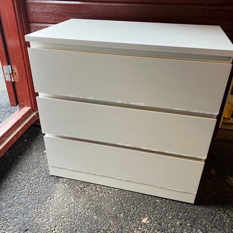 Har noen små bruksmerker på kantene (legger ved bilde) og noen inni skuffene (kan ikke sees på utsiden av nattbordet).