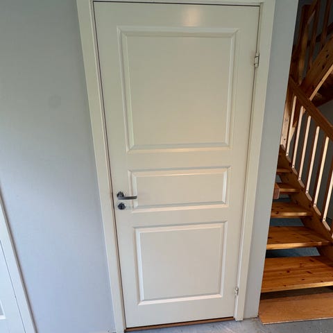 Kompakt innerdør i hvit (egghvit?) utførelse med profilert fylling. Dørhåndtak og låskasse montert. Fremstår som pent brukt men noen få bruksmerker.