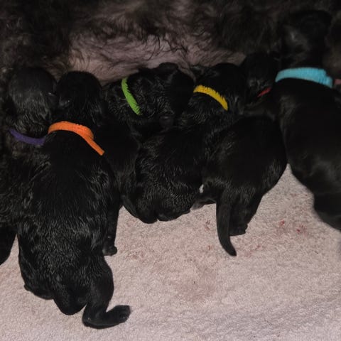 6 Blandingvalper født 03.04 selges til 5 stjerners hjem når dei er 8uker. Leveringsklar 29mai. 3 gutter og 3 jenter. En brun, en helsvart, en svart med kvit lyn under magen og en svart med kvite labber. Blir oppdatert med kjønn etter kvart.