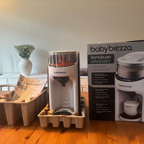 Baby Brezza Formula Pro Advanced morsmelkerstatningsmaskin. En automatisk maskin for tilberedning av morsmelkerstatning i flaske. Maskinen blander pulver og vann og doserer direkte i flasken. Den har flere temperaturinnstillinger, justerbar mengde og passer til de fleste flasketyper og merker av morsmelkerstatning. Vanntanken er avtakbar og kan fylles og rengjøres separat. Egnet for tilberedning av måltider til spedbarn og småbarn.