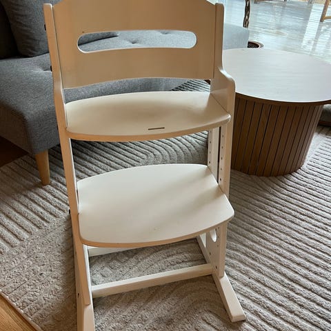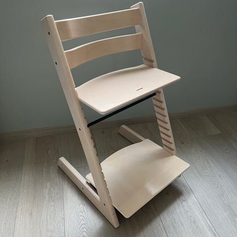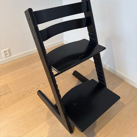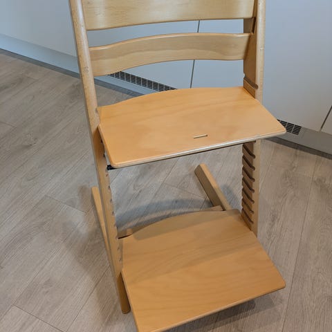 Stokke Tripp Trapp høy barnestol i gul farge. Klassisk trappeformet stol med justerbart sete og fotbrett som kan tilpasses barnets høyde. Stolen har glidere bak for økt stabilitet. Egnet som spise- og sitteplass ved bord for barn over tid, ettersom høyden kan reguleres etter behov.