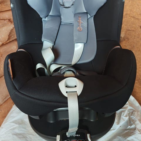 Pent brukt Cybex barnesete i størrelse 18 i svart. Setet har integrert intern 5-punkts sele med polstrede skulderremmer og justerbar høyde på hodestøtten. Trekket er tekstil i mørk farge. Barnesetet er beregnet for montering i bil og har tydelige merkinger for korrekt plassering i forhold til airbag og barnets høyde.