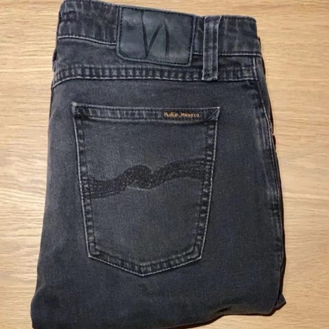 Nudie Jeans olabukse for herre i svart denim. Buksen har livvidde W33 og lengde 32, tilsvarende herrestørrelse M Klassisk 5-lommers modell med kontrastsømmer og skinnpatch med logo bak i linningen. Materiale i denim som egner seg til hverdagsbruk.