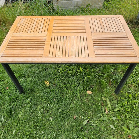 Pent brukt teakbord i heltre teak i FSC sertifisert materiale til salgs. Kjøpt hos danske Dacore. Nypris 13.000 NOK. Ingen skader, Treverket er ubehandlet, fått litt patina men holder fremdeles den vakre naturlige teakfargen. Har uttrekksplate, kan utvides fra 150-200 cm. Bredde 90 cm.