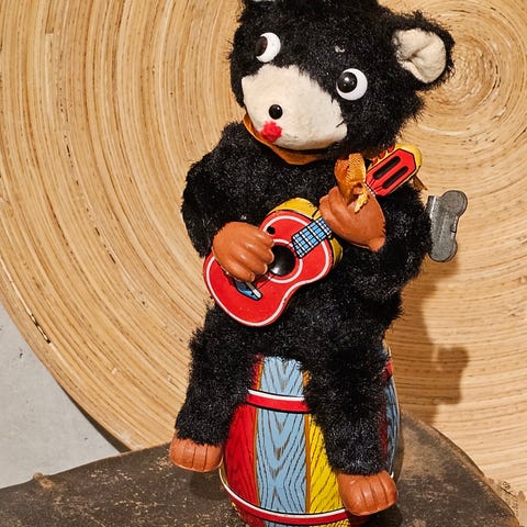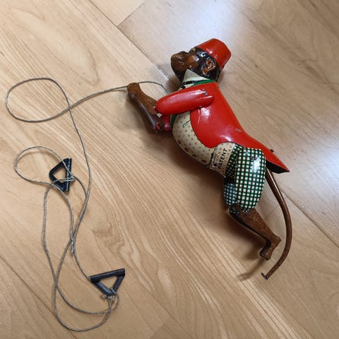 Denne stakkaren feier gulvet når den pumpes opp med luft. Sjarmerende leke fra 50/60-tallet som fungerer helt som den skal. Ingen produsentmerking. Jeg lagde en video for å vise feiingen, men får dessverre ikke lastet den opp til annonsen, men jeg kan sende den, hvis noen er interessert. Høyde 13 cm.