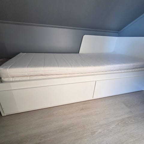 Brimnes seng fra Ikea. 180× 200 cm. Mye bruk igjen. 4 praktiske skuffer til oppbevaring. Demontert.