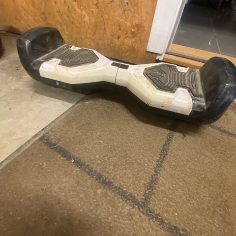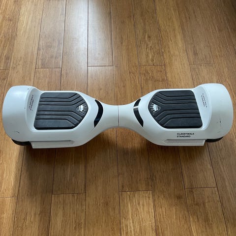 Hoverboard med gokart-sete. Hoverboardet er i svart farge med to hjul og sklisikre fotplater. Setet er et gokart-tilbehør i rød og svart med justerbar ramme, håndtak og styrearmer. Setet monteres på hoverboardet med stropper og gjør at brettet kan brukes som en go-kart. Egnet for bruk på jevne underlag utendørs eller innendørs, avhengig av plass og underlag. Lader følger ikke med