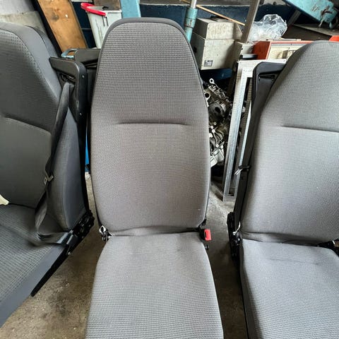 Jany bilsete i grå tekstil. Integrert setebeltefeste i setet. Egnet som ekstra passasjersete i varebil eller minibuss der kjøretøyet er tilpasset denne typen understell og skinnesystem.