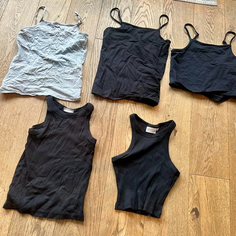 Toppesett for jente i størrelse 146/152. Settet består av flere overdeler i bomull, inkludert singleter, en kortermet topp og en langermet body. Fargene går i svart, hvitt og grått. Plaggene passer til hverdagsbruk, under gensere eller som innerlag. Bomullsmaterialet gir myk og behagelig bruk for barn i aktuell størrelse.
