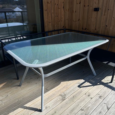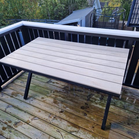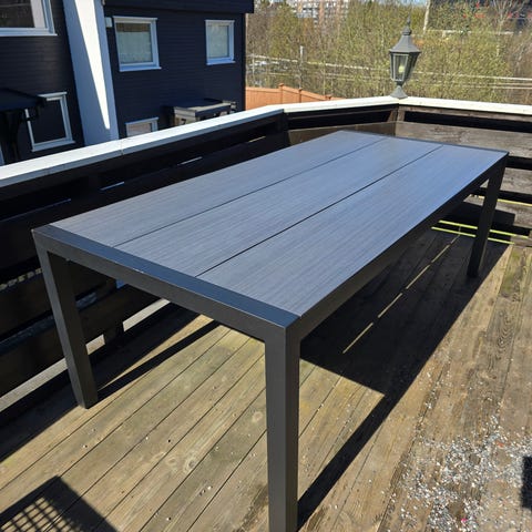 Rektangulært utebord/spisebord for terrasse eller hage. Bordplaten består av grå, bordformede planker i kompositt eller lignende materiale, og understellet er i mørklakkert metall med kryssformet benkonstruksjon på midten. Bordet gir god plass til flere sitteplasser og passer til bruk utendørs på platting, veranda eller i hage. Egnet sammen med ulike typer utestoler i metall, tre eller kunstmateriale.