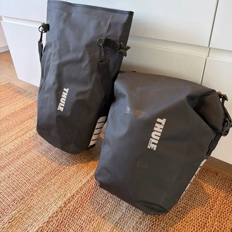 Ortlieb sykkelvesker i svart, vanntett materiale. Veskene festes til sykkel, for eksempel på bagasjebrett eller styre, avhengig av modell og festeanordning. Egnet til transport av utstyr, klær eller andre eiendeler på sykkelturer og pendling. Materialet er glatt og lett å tørke av. Veskene har rullelukking på toppen for å beskytte innholdet mot regn og sprut.