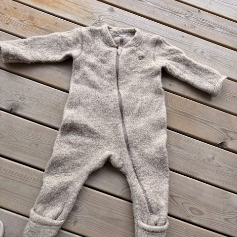 Hust & Claire ulldress i brun farge, unisex, størrelse 80. Dressen er laget i ull og har glidelås foran for enkel av- og påkledning. Lang erm og lange ben gir god dekning og varme. Passer godt som mellomlag eller ytterplagg avhengig av temperatur. På bildene følger det også med en brun lue, men hovedplagget er ulldressen i ull.