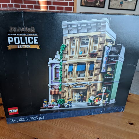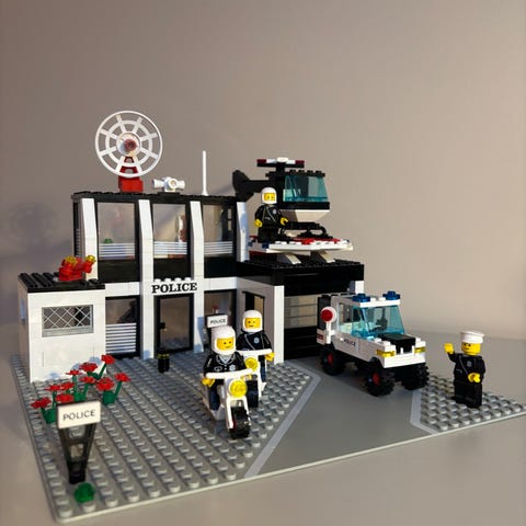 LEGO System politistasjon byggesett. Sett med politistasjon, kjøretøy og minifigurer slik som vist på bildene. Inneholder blant annet bygning med flere etasjer, helikopterlandingsplass, helikopter, politibiler, motorsykkel og flere politifigurer. Passer sammen med andre LEGO System-klosser og kan bygges om eller kombineres med andre sett for utvidet lekemiljø.