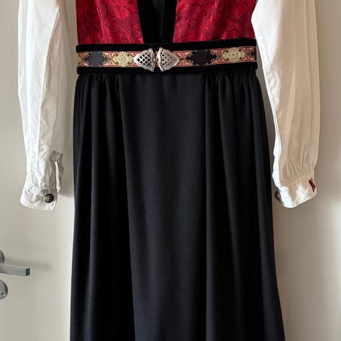 Pent brukt vestlandsdrakt selges med to søljer, beltespenne, mansjettknapper, veske og hvit skjorte med Bryggen-mønster.