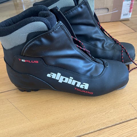 Alpina TCL langrennsstøvler i størrelse 38. Modellen er en klassisk langrennsstøvel med overdel i syntetisk materiale, tekstilfôr og yttersåle i plast/gummi. Fargen er hovedsakelig svart med røde lisser og detaljer, samt hvit Alpina-logo på siden. Støvlene har glidelås over vristen som beskytter lissene og gir ekstra lukking rundt ankelen. Egnet til klassisk langrenn på ski med kompatibelt bindingssystem (se såle/bindingstype ved behov).