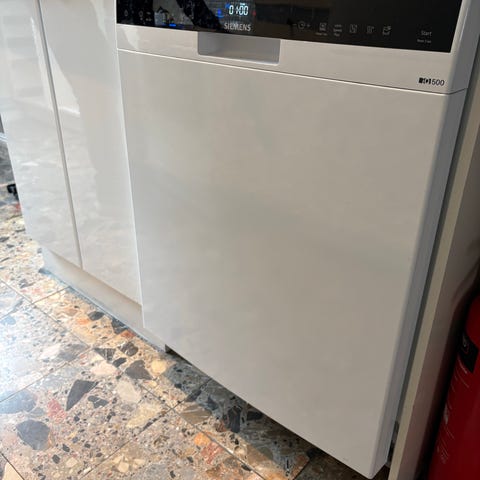 Siemens underbygd oppvaskmaskin. Modellen er beregnet for integrering under benk og har frontpanel i hvitt. Maskinen har oversiktlig betjeningspanel øverst på fronten. Egnet for montering i standard kjøkkeninnredning der det er plass til underbygd oppvaskmaskin i full bredde.
