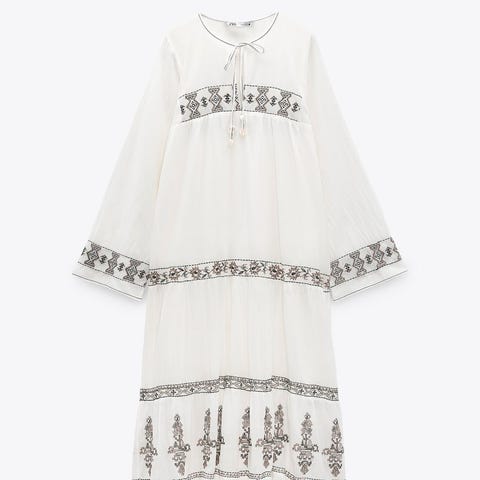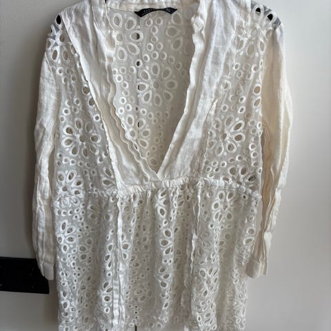 Zara sommerkjole i lin for dame i størrelse S. Kjolen er flerfarget med lys bunn og broderte blomster- og mønsterdetaljer i ulike farger. Modellen har lange ermer, V-utringning og dekorert halsåpning. Materialet i lin gir et lett og luftig plagg som egner seg godt til bruk på varme dager eller som en avslappet hverdagskjole.