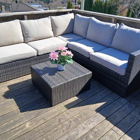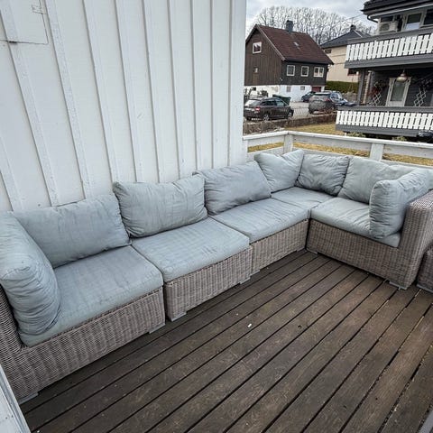 Modulær hagesofa i kunstrotting med beige sitte- og ryggputer. Settet består av flere sofamoduler som kan settes sammen til hjørnesofa, samt et lavt bord og en fotskammel/puff i samme materiale. Putetrekkene er nyvasket og er noe falmet av solen. Gruppen er lagret inne om vinteren og er uten skader, bortsett fra at puffen mangler et ben i midten, men det er ikke synlig og er erstattet av et tilpasset ben.
