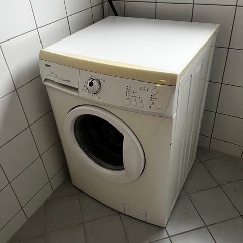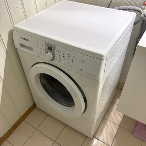 Samsung frontmatet vaskemaskin i hvit utførelse. Funger, men har et hakk i gummilisten.