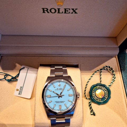 Vi har gleden av å presentere en pent brukt, unik utgave av en 36mm OP. Mer sjeldent enn Tiffany skive får du det ikke. Klokken ble discontinued i 2022, her har du mulighet til å skaffe deg et meget pent eksemplar.