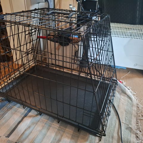 Eukanuba hundefôr og Happy Dog hundefôr sammen med et svart metall hundebur.