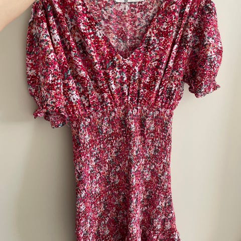 NA-KD sommerkjole i størrelse 36. Kjolen er laget av viskose og har rosa blomsterprint. Modellen har V-hals med volangdetaljer, dyp utringning i ryggen og markert midje med knytebelte. Nederst har kjolen en kort lengde med volangkant. Passer som lett sommerkjole til hverdagsbruk eller enkle anledninger.