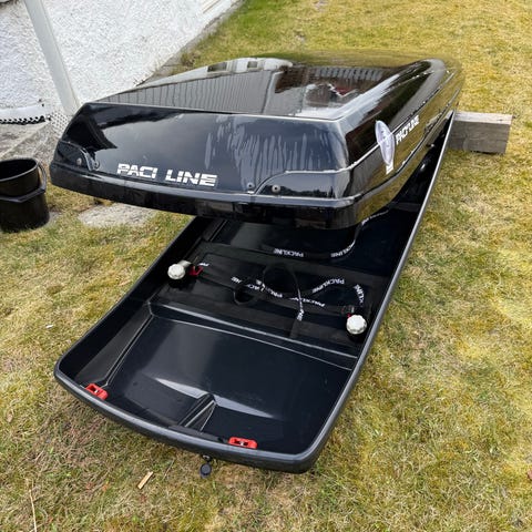 Packline takboks i svart farge. Takboksen monteres på takstativ og gir ekstra lasteplass på bilen. Innvendig er det festepunkter og stropper for sikring av bagasje. Egner seg til transport av bagasje, ski og annet utstyr på bilturer. Takstativ medfølger etter bildene, og er tilpasset montering av takboksen.