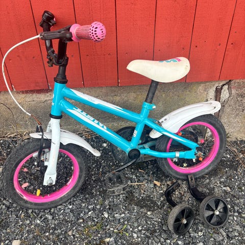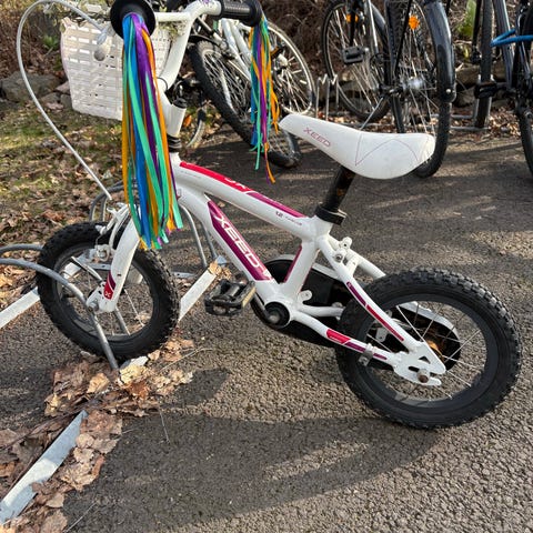 White barnesykkel 12" blå, hvit og rosa