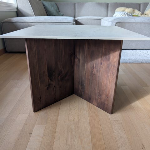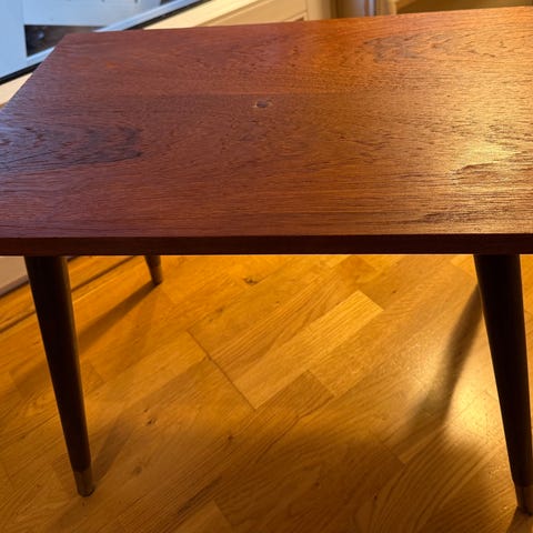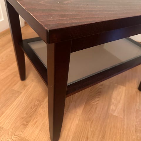 Tre sidebord i rektangulær form med brun treoverflate. Bordet har fire rette ben og en enkel ramme under bordplaten som gir stabilitet. Passer som sidebord ved sofa eller stol, som lite kaffebord eller som avlastningsbord i stue, gang eller soverom.