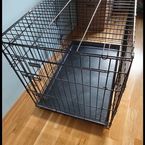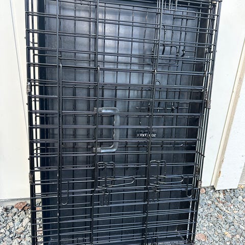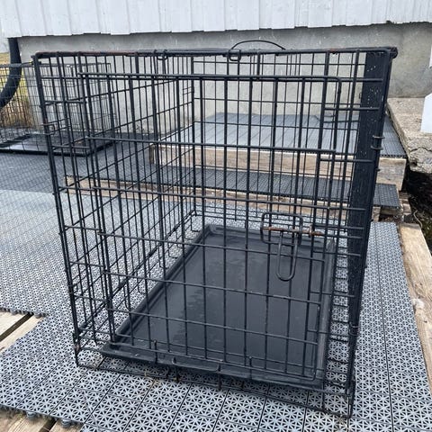 Hundebur i metall med sammenleggbart design. Buret har svart metallramme og avtagbar bunnplate i plast/metall for enkel rengjøring.