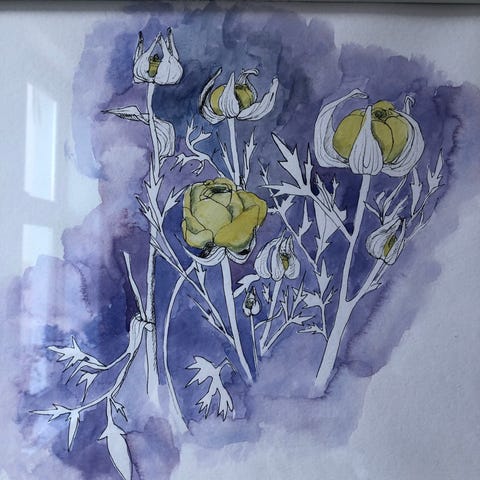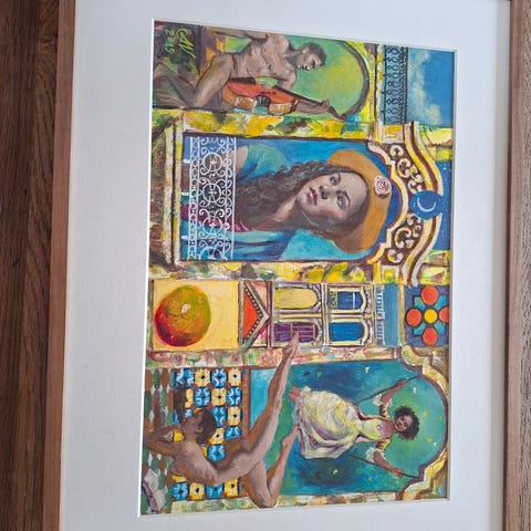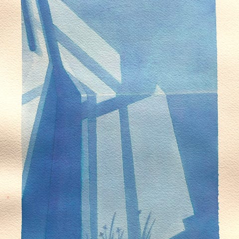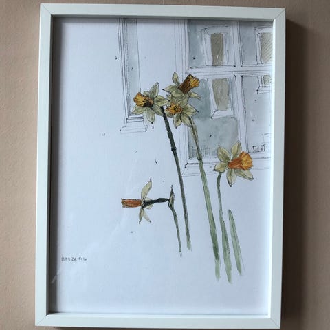 Innrammet akvarellmaleri med motiv av en plante foran et vindu. Bildet er utført i dempede blå- og grønntoner med en lys, enkel ramme rundt. Kunstverket viser et interiørutsnitt med vindu, gardin og plante i forgrunnen. Passer som veggdekor i stue, gang, soverom eller kontor. Nøytrale farger gjør at bildet kan kombineres med ulike innredningsstiler.