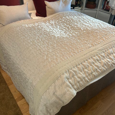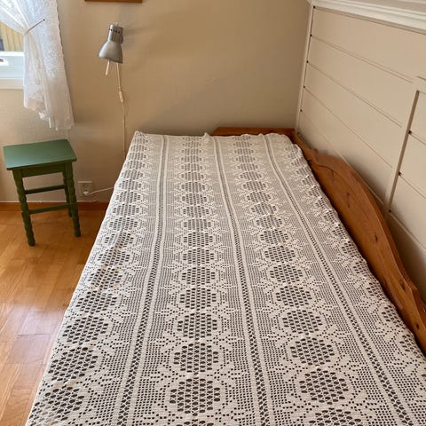 Sengeteppe heklet hvit. Består av små heklede duker sydd sammen. Noen flekker. Dobbelseng (seng på bilde er 180 cm bred).