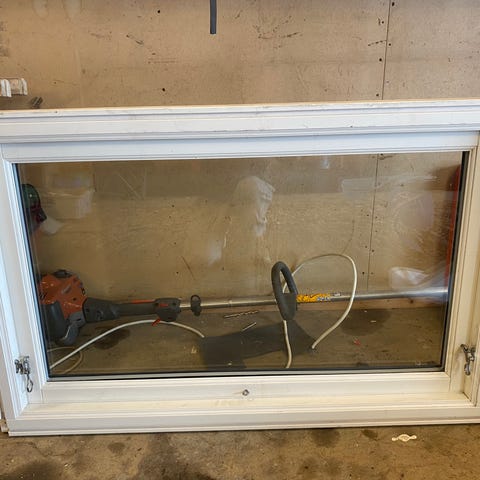 Et lags vindu til bod. Mørke grå karm. Ikke mulig å åpne vinduet. Utvendig mål er 99,5cm x 59,5 cm. Vindet er ubrukt