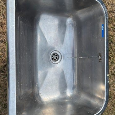 Rustfri stålvask / utslagsvask i god stand. Vasken er rustfritt stål og det følger med blandebatteri med to hendler. Egnet som arbeidsvask eller grovvask i for eksempel vaskerom, garasje eller verksted. Leveres med avløpstilkobling som vist på bildene.