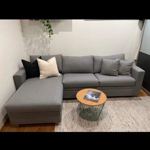 To år gammel sovesofa fra sovesofaspesialisten. Kjøpt helt ny i butikk. Enkle å slå ut. Har fungert som vår ordinære sofa i stua. Veldig god å sove på og har lagring under.