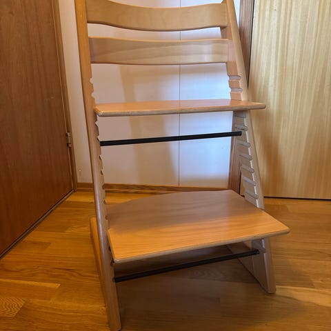 Klassisk trappeformet stol med justerbar sitteplate og fotbrett som kan tilpasses barnets høyde.