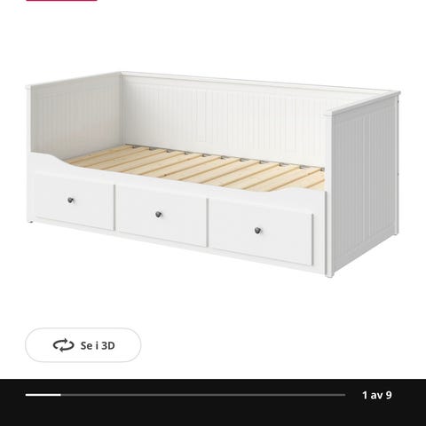 IKEA Hemnes dagseng med oppbevaring. Dagsengen har tre skuffer under for oppbevaring. Den kan brukes som enkeltseng til hverdags og trekkes ut til dobbeltseng ved behov. Ribbebunn følger med. Farge: hvit. Passer til standard madrasser i tilsvarende mål som vist på tegningen i annonsen. Egnet som seng eller sofa i for eksempel barnerom, gjesterom eller stue.