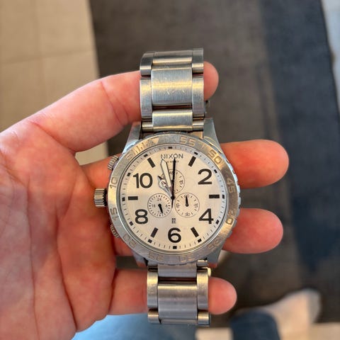 God som ny, klokken har nesten ikke blitt brukt som den bærer preg av. Ingen riper eller skrammer. Fungerer som den skal. Følger med ekstra lenker og original eske.