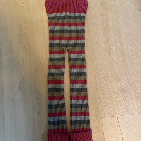 Nøstebarn ullbukse for jente i størrelse 98/110. Buksen er ribbestrikket i ull med mørkerosa, lyserosa, grå og brune striper. Den har strikk i livet for god passform og lange bein som kan brettes opp eller ned for å justere lengden. Disse buksene varer lenge, ofte flere vintre på rad. Egnet som varm og myk bukse til hverdagsbruk eller som lag under yttertøy i kjøligere vær.