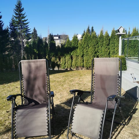 Sammenleggbar hagestol i grått tekstilmateriale med metallramme. Stolen har høy rygg, armlener og justerbar rygg.