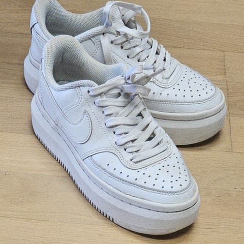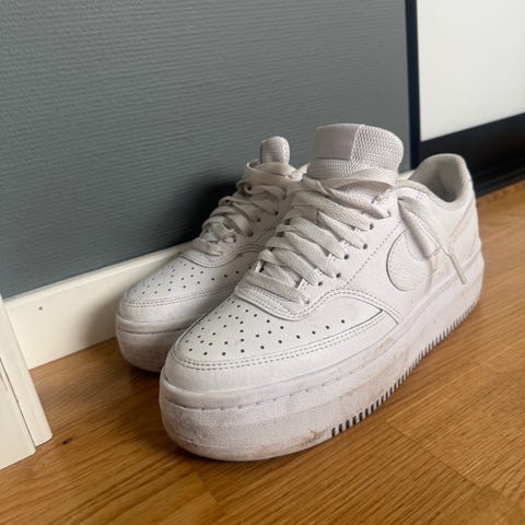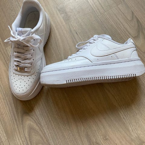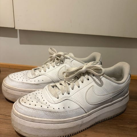 Nike sneakers joggesko i størrelse 36.5 Modellen er lave joggesko i helhvit farge med snøring og perforert tåparti. Overdelen ser ut til å være i syntetisk materiale eller skinnimitasjon, med gummisåle og tydelig Nike-logo på sider og hæl. Passer til hverdagsbruk og fritid. Merk at nøyaktig modellnavn ikke er spesifisert.