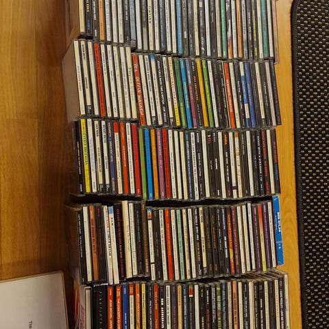 Over 160 Diverse musikk CD-samling med flere titler i standard CD-format. Platene er pakket i plastcover og er stablet i flere kolonner. Innholdet ser ut til å være en blanding av ulike artister og sjangre. Egner seg for deg som ønsker å utvide eller komplettere en fysisk CD-samling.
