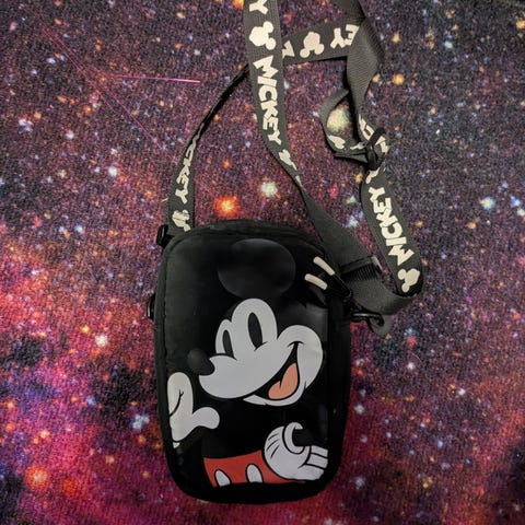 Disney stoffveske unisex med helprintet Mickey Mouse-mønster. Vesken er laget i stoff med svart bunnfarge og motiv av hjerter og Mickey-tekst i flere farger. Den har et hovedrom med glidelåslukking, samt ytre lommer, blant annet en nettinglomme på siden. Justerbar skulderreim gjør at vesken kan bæres over skulderen eller i hånden. Egnet som liten hverdagstaske, turveske eller barneveske.
