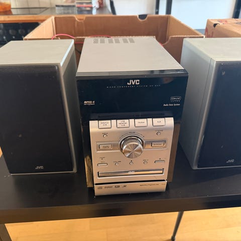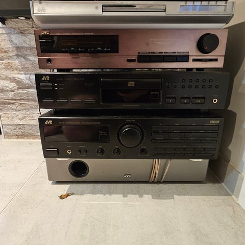 JVC hjemmekino reciever med center speaker og subwoofer.