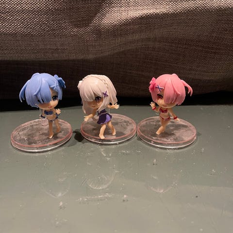 Anime figursett bestående av flere PVC-figurer med blått hår i ulike antrekk og positurer. Figurene står på runde sokler og har detaljerte klær og tilbehør. Egnet som samleobjekter eller dekorasjon for fans av japansk anime og figuriner. Materiale er hard plast/PVC med malt overflate. Størrelse er typisk hyllefigur, beregnet for utstilling innendørs.