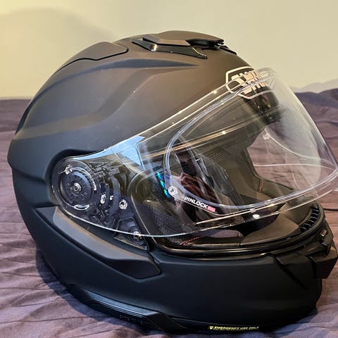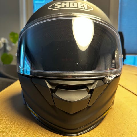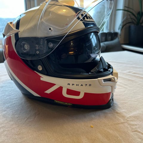 Shoei mc-hjelm av typen helhjelm. Hjelmen har ytre skall i hvit farge med røde og blå detaljer. Den har klart visir i front samt integrert solvisir på innsiden. Innvendig er hjelmen polstret med avtagbart og vaskbart interiør. Egnet som motorsykkelhjelm til vei- og turkjøring.