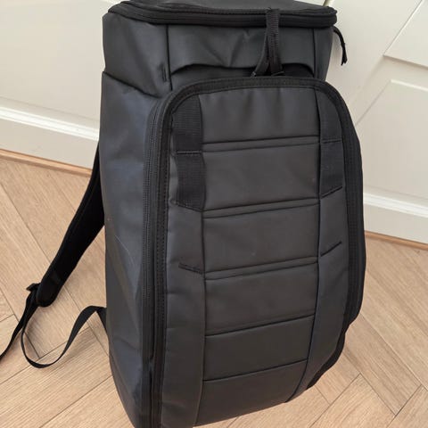 DB ryggsekk i kunstlær for unisex. Sekken er svart og har et stilrent, rektangulært design med polstret front og justerbare skulderstropper. Topplokket åpnes med glidelås og innsiden har flere lommer og glidelåslommer for organisering av innhold. Passer til hverdagsbruk, reise eller pendling, med plass til klær, bøker eller annet utstyr.