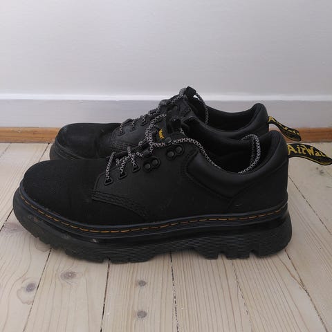 Dr. Martens sko i svart skinn i størrelse 43. Klassisk modell med kraftig, mønstret såle som er olje-, fett-, syre-, bensin- og alkalieresistent, merket «Made in England». Overdel i glatt skinn med snøring og polstret kant rundt ankelen. Egnet som robuste hverdagssko eller arbeidssko der det er behov for slitesterk såle og godt grep.